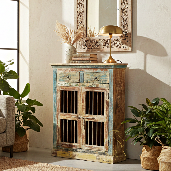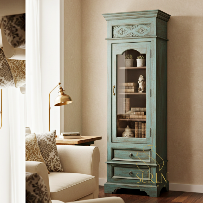 Immerse yourself in the world of our old India hand-carved bookshelf cum display cabinet, an excellent combination of traditional and modern functionality. Our skillfully crafted piece, merging a bookshelf with a display cabinet, is more than just furniture – it’s an inquisition of the cultural richness of India. Let’s discover the charm of the old, admire the intricate designs of a hand-carved wonder, and enjoy the timeless elegance of vintage, painted, and wooden furniture that goes beyond very storage, making a bold style statement.