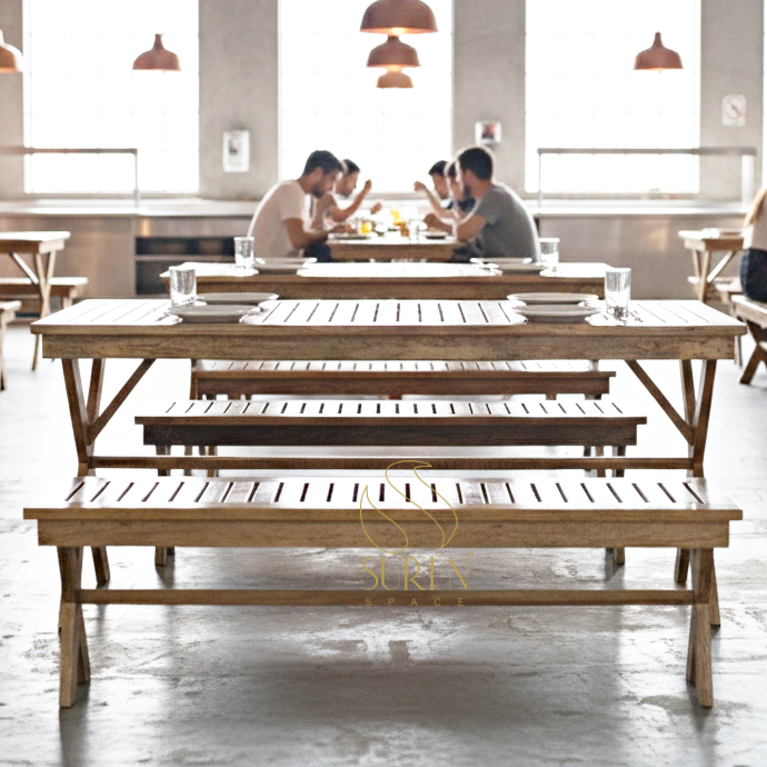 - Product : Solid Wood Semi Outdoor Canteen Food Court Table Bench Set