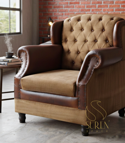 Wing Back Duel Material Vintage Design Leather Sofa